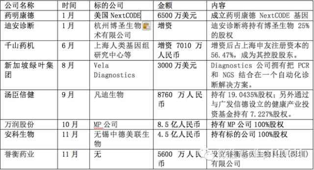 2015年,不僅成立了數量眾多的基因公司,并且,發生了多起收購事件,收購的目的主要是切入基因行業或搶占地盤。其中比較重大的收購包括藥明康德、千山藥機、迪安診斷、綠葉集團、湯臣倍健、萬潤股份、安科生物、譽衡藥業。這些公司中,很多都是轉型到基因產業,玩家眾多表明各方十分看好基因產業的發展前景。