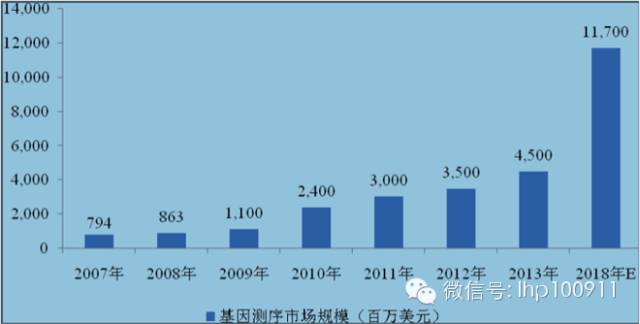 近幾年來基因測序市場飛速發展,據BBC RESERCH統計,從2007年的7.94億美元增長到2013年的45億美元,年復合增長率為33.5%,預計未來幾年依舊會保持快速增長,2018年將達到117億美元,年復合增長率為21.1%。隨著進入基因產業的公司的迅速增加,以及監管政策的逐漸寬松,中國也將迎來新一輪大發展期。