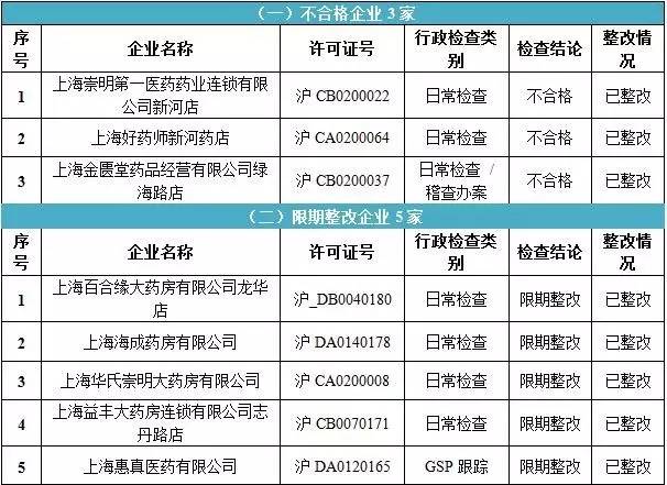 導讀今日,上海市藥監局發布兩個通告,分別是關于2016年2-3月份本市藥品批發(連鎖)企業和藥品零售企業行政檢查信息的通告(2016年2-3月份)。其中,共有3家藥商不合格,13家藥商被要求限期整改。 在2016年2月——3月中,上海市藥監局相關監管部門對80家藥品批發(連鎖)企業實施了GSP跟蹤檢查、GSP專項檢查、日常檢查,其中,限期整改企業8家,合格企業72家。 以下為被要求限期整改的8家企業詳情: 在2016年2月——3月中,上海市藥監局相關監管部門對894家藥品零售企業進行了行政檢查,其中不合格企業3家,限期整改企業5家,合格企業886家。 以下為被要求限期整改的5家企業和3家不合格企業詳情: 信息來源:醫藥觀察家網