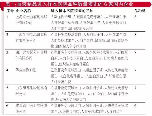 據CFDA數據,目前國內擁有血液制品生產許可范圍的企業共28家,其中7家企業有6個(含6個)以上品種進入樣本醫院銷售,包括上海萊士血液制品股份有限公司(8個)、上海生物制品研究所有限責任公司(8個)、四川遠大蜀陽藥業股份有限公司(7個)、華蘭生物工程(7個)、山東泰邦生物制品有限公司(7個)、成都蓉生藥業有限責任公司(6個)。(見表1)