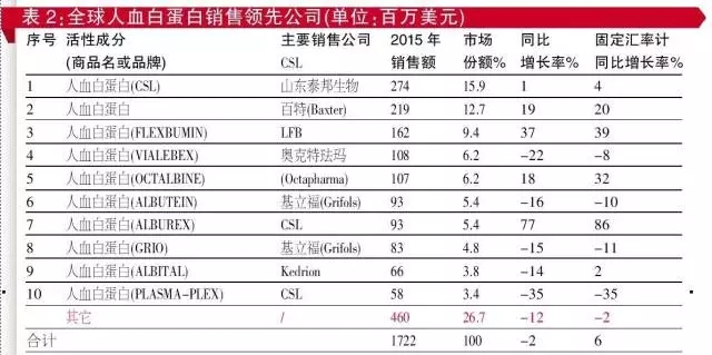 據統計,2014年10月至2015年9月,按制劑出廠金額計,全球人血白蛋白市場規模約為17億美元,中國人血白蛋白市場規模為5.7億美元,同比增長12%,是全球人血白蛋白市場規模最大的國家;美國居第二位,達2.7億美元,同比增長6%。全球人血白蛋白銷售領先公司見表2。可喜的是,山東泰邦生物制品有限公司在全球人血白蛋白銷售領先公司之列,并居第二位。