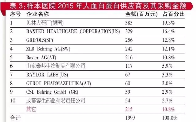 據PDB數據,2015年樣本醫院人血白蛋白供應商有32家,前10家采購金額及其所占份額見表3。