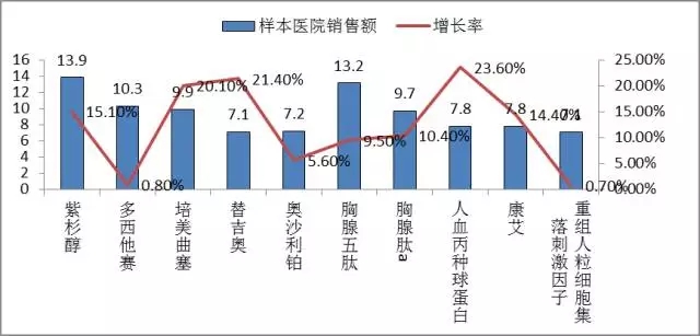 考慮到中國(guó)每年新增超過(guò)300萬(wàn)惡性腫瘤患者人群,這使得中國(guó)抗腫瘤用藥市場(chǎng)始終保持較快速度的增長(zhǎng)態(tài)勢(shì),即便是在醫(yī)藥市場(chǎng)總體增速明顯放緩的大背景下。從樣本醫(yī)院數(shù)據(jù)來(lái)看,2014年樣本醫(yī)院抗腫瘤用藥銷售額達(dá)到158億元,同比大幅增長(zhǎng)13.7%。
