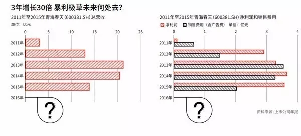 從2009年問世至今,青海春天先后經(jīng)歷“身份門”“超標(biāo)門”“叫停門”等多輪爭議,也曾創(chuàng)造業(yè)績神話——“極草”牌28克裝“至尊含片”售價(jià)高達(dá)29888元,一克1054元,超過黃金價(jià)格3倍;三年凈利潤增長30倍,從2011年的1159.61萬元增長至2014年的3.66億元;2014年9月,借殼上市成為“蟲草第一股”,股價(jià)最高沖上50元頂峰,總市值超300億元。