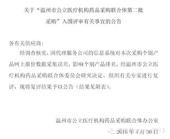 2016年浙江省溫州市關于公立醫療機構藥品采購聯合體第二批采購的補充公告