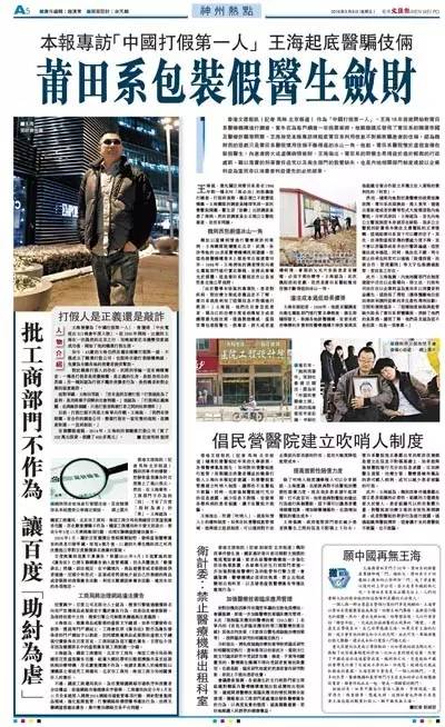 (記者劉凝哲)王海與莆田系鬥了18年,莆田系的游醫產業鏈卻越「鬥」越壯大,莆田系不少四處貼小廣告的小診所卻「鬥」成了資產數以億計的上市公司。若不是青年魏則西之死,令莆田系再度站在曝光臺上,人們仍會將大把的救命錢扔給這些唯利是圖的不法商人。