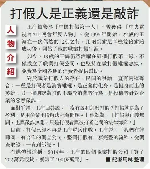 話說回來,如果中國各行業準入嚴格、管理規範、監管得力、執業標準、懲處及時,這個社會也許將不再需要王海這樣的職業打假人。願中國再無王海。