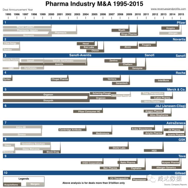 下面將著重對1995年至2015年這二十年間并購活躍的全球十大制藥公司10億美元以上的重大交易進行梳理。