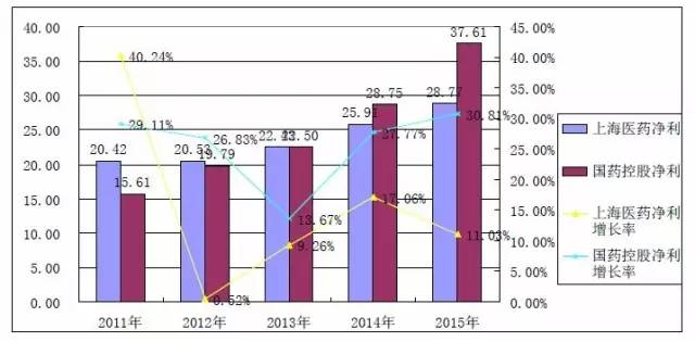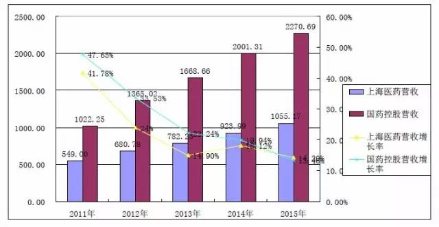 從營(yíng)業(yè)收入來(lái)看,兩家企業(yè)過(guò)去五年增速都不錯(cuò),實(shí)現(xiàn)翻番,2015年,國(guó)藥控股營(yíng)收達(dá)到2270.69億元,上海醫(yī)藥達(dá)到1055.17億元。從增速看,國(guó)藥控股的增速更快,但增速都逐年下滑,從2011年的40%以上,下降到2015年的15%以內(nèi),與國(guó)內(nèi)醫(yī)藥產(chǎn)業(yè)發(fā)展趨勢(shì)相吻合。
