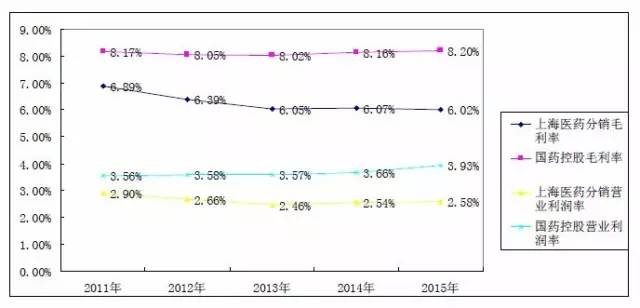 兩家是國(guó)內(nèi)醫(yī)藥流通領(lǐng)域的龍頭企業(yè),上海醫(yī)藥的工業(yè)比重較大,我們僅將分銷業(yè)務(wù)的毛利率與國(guó)控比較。