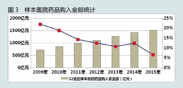 據中國醫藥工業信息中心PDB數據庫統計,2015年22城市樣本醫院藥品購入金額同比增長為6.58%,比去年同期下降5個百分點。