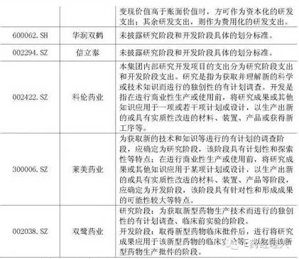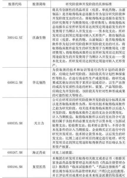 通過與同行業(yè)公司及恒瑞醫(yī)藥相關(guān)政策的比較,同行業(yè)公司界定開發(fā)階段的起點主要分兩類,一是以可以進入臨床或以申報期為起點,二是進行商業(yè)化生產(chǎn)或使用前。