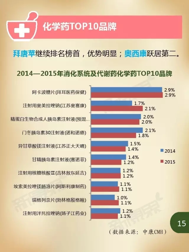 ◢2014-2015年消化系統(tǒng)及代謝藥化學(xué)藥TOP10品牌中,拜唐蘋(píng)繼續(xù)排名榜首,優(yōu)勢(shì)明顯;奧西康躍居第二。