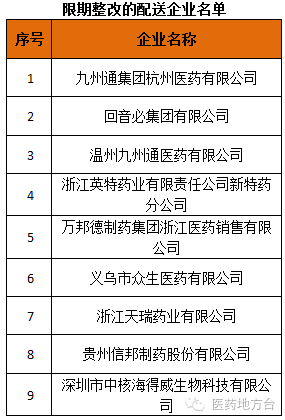 二、限期整改。因企業訂單操作不規范、配送不及時以及區域選擇性供貨等原因,造成配送率未達標,給予九州通集團杭州醫藥有限公司等9家企業限期整改的處理。整改期限為6月16日至7月15日,后期我中心將根據期限內整改情況做進一步處理。