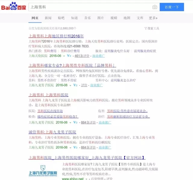 通過百度搜索了“上海”和“男科”等關鍵詞,得到的結果中均有被標注為“商業推廣”的醫院信息置于搜索結果頂部,說明百度在資本面前“言出必行”——“隨著公司通過調整經營方式來適應新的監管規范,他們有望借助‘高品質’醫療客戶逐步恢復業務。”