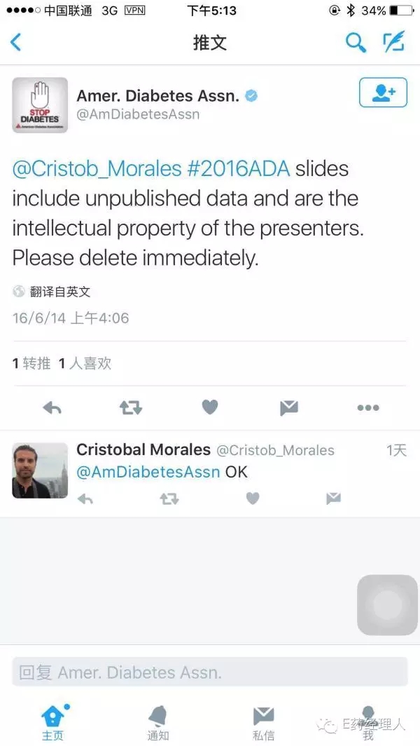 “2016美國糖尿病協會會議的幻燈片包括未發表的數據,演示者擁有該數據的知識產權。請立即刪除。”美國糖尿病協會的官方Twitter賬號寫道。