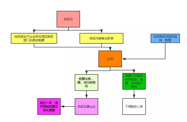 公立醫療機構在入庫驗收藥品時,必須驗明票、賬、貨三者一致方可入庫、使用,不僅要向為其配送藥品的流通企業索要、驗證發票,還應當要求流通企業出具加蓋其原印章的由生產企業提供的進貨發票復印件,兩張發票的生產企業名稱、藥品批號等相關內容互相印證,且作為公立醫療機構支付藥品貨款憑證,納入財務檔案管理。每個藥品品種的進貨發票復印件至少提供一次。鼓勵有條件的地區通過信息化手段驗證“兩票制”。