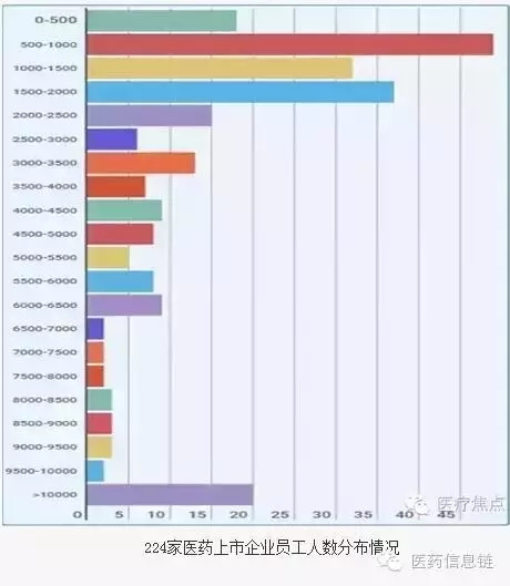 244家醫(yī)藥上市企業(yè)中,500人以下的企業(yè)有18家,10000人以上的企業(yè)有21家。