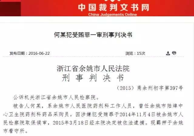近日,裁判文書網站公布的判決書顯示,余姚陸埠鎮衛生院的藥劑科采購員在藥品采購中,為醫藥代表提供便利,收受現金25萬余元。