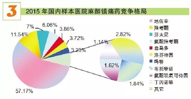 2015年,國(guó)內(nèi)樣本醫(yī)院麻醉鎮(zhèn)痛藥TOP10品種用藥金額11.25億元,占據(jù)該類市場(chǎng)97%。其中,居第一位的地佐辛就占據(jù)57.17%。