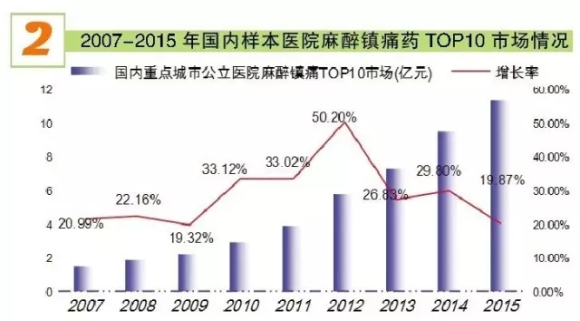 據(jù)米內(nèi)網(wǎng)HDM系統(tǒng)數(shù)據(jù),2015年國(guó)內(nèi)重點(diǎn)城市公立醫(yī)院神經(jīng)系統(tǒng)用藥市場(chǎng)規(guī)模為134.13億元,同比上一年增長(zhǎng)了6.55%;其中,麻醉鎮(zhèn)痛藥市場(chǎng)有29個(gè)藥物,用藥金額為11.58億元,同比上一年增長(zhǎng)了18.89%,遠(yuǎn)高于神經(jīng)系統(tǒng)用藥市場(chǎng)增長(zhǎng)率,成為近年快速增長(zhǎng)的品類。