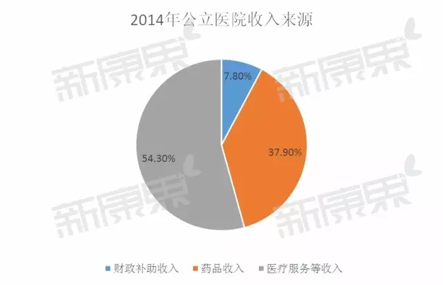 公立醫(yī)院收入的來源主要分為三個(gè)部分,各種醫(yī)療服務(wù)項(xiàng)目收費(fèi)、銷售藥品收入和國家財(cái)政補(bǔ)助,2014年公立醫(yī)院這三項(xiàng)的收入分別占54.3%、37.9%和7.8%,醫(yī)院作為醫(yī)療機(jī)構(gòu)醫(yī)療服務(wù)收費(fèi)理所當(dāng)然應(yīng)當(dāng)是主要來源,而藥品收入所占據(jù)的比例仍然較高,國家財(cái)政補(bǔ)貼所占不足一成。