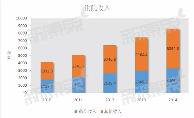 雖然藥品收入仍占據(jù)較高的比例,但是縱向來看,受國家“醫(yī)藥分家”政策的影響,醫(yī)院靠銷售藥品獲得的收入呈現(xiàn)逐年遞減的趨勢(shì)。從2010年的41.8%降低到2014年的37.9%,下降了約4個(gè)百分點(diǎn)。