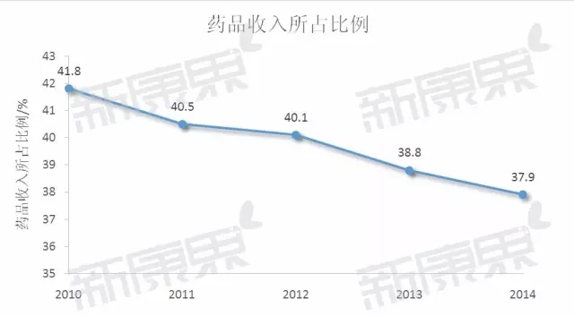 近年來,由于新型醫(yī)療體制改革,我國公立醫(yī)院數(shù)量呈現(xiàn)出逐年遞減的趨勢(shì),但其年均收入上升較快。醫(yī)院銷售藥品收入呈現(xiàn)逐年遞減趨勢(shì),從2010年的41.8%降低至2014年的37.9%,下降了約4個(gè)百分點(diǎn)。