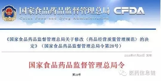 根據(jù)CFDA公告內(nèi)容,為進(jìn)一步加強(qiáng)藥品經(jīng)營(yíng)質(zhì)量管理,保障藥品安全,2016年6月30日,國(guó)家食品藥品監(jiān)督管理總局局務(wù)會(huì)議審議通過(guò)《關(guān)于修改<藥品經(jīng)營(yíng)質(zhì)量管理規(guī)范>的決定》,自公布之日起施行?!端幤方?jīng)營(yíng)質(zhì)量管理規(guī)范》經(jīng)修改后全文重新公布。