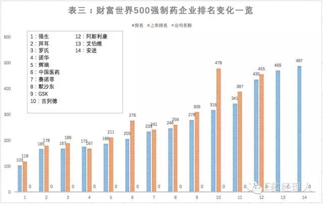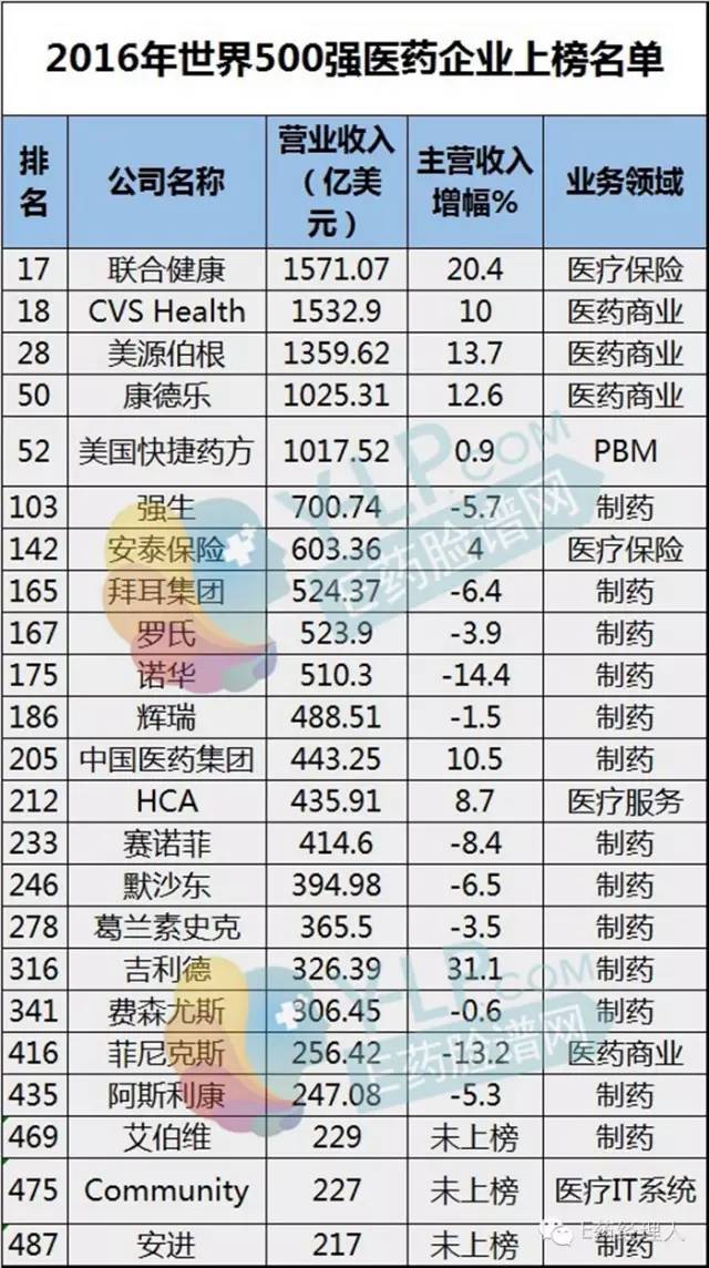 制藥企業中,艾伯維和安進為首次登上世界500強榜單,分列第469位和487位。中國醫藥集團連續第四年上榜,排名從2013年的第446位上升至2016年的第205位,前進了241個身位。