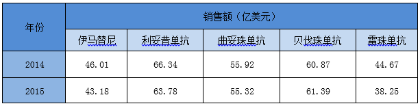 由于腫瘤靶向治療藥物的作用機(jī)理明確,副作用小,治療費(fèi)用高,研發(fā)投入回報(bào)大等特點(diǎn),90年代開始,全球一度掀起狂熱的研發(fā)風(fēng)暴,并于2000年后陸續(xù)申請(qǐng)獲批上市,穩(wěn)坐抗腫瘤藥物的第一交椅。去年全球藥品銷售數(shù)據(jù)中,腫瘤靶向治療藥物就有5個(gè)進(jìn)入TOP50,如表1所示,其中就有4個(gè)為生物制藥-單克隆抗體。