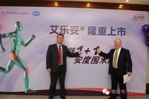 2013年艾樂妥中國上市,中美上海施貴寶制藥有限公司總裁彭振科先生(左)與輝瑞中國總經理吳曉濱博士(右)