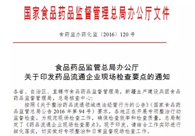 近日,“國家藥監總局辦公廳《關于印發藥品流通企業現場檢查要點的通知》”流傳出來!