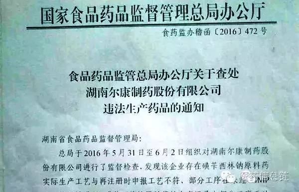 關于此次對爾康制藥的查處經過,小編了解到,5月31日至6月2日,國家食藥監總局對爾康制藥進行了監督檢查,發現爾康制藥存在原料藥實際生產工藝與再注冊時申報工藝不符、部分工序在未經GMP認證的場地進行、原料藥批生產記錄中部分工序無法溯源等問題