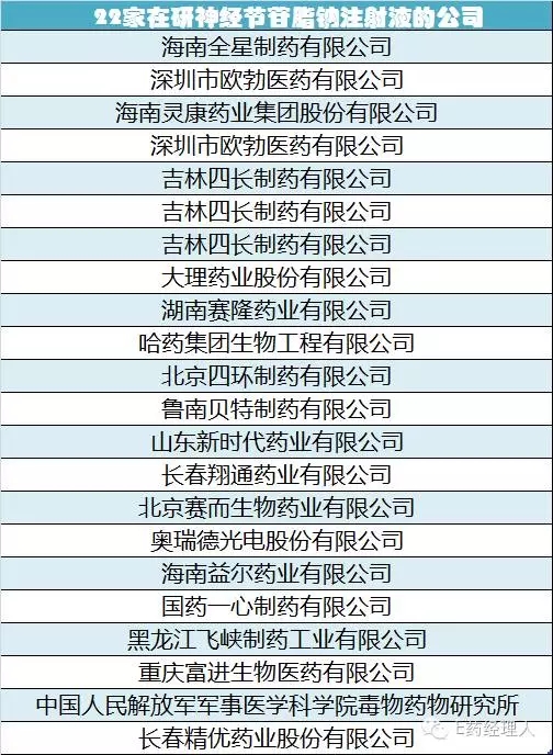 除了這些已經有單唾液酸四己糖神經節苷脂鈉注射劑上市的公司外,還有22家公司正在進行這一藥物的申報或者臨床試驗,這些公司是:
