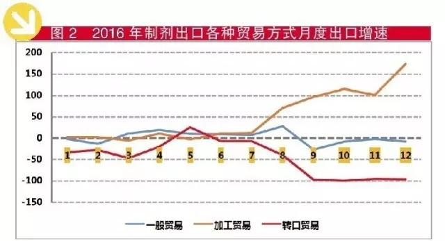相比之下,保稅區倉儲轉口貿易出口同比大幅下跌44%,占制劑整體出口的12.95%,同比2015年下降了10個百分點。一般貿易出口則基本與去年持平。