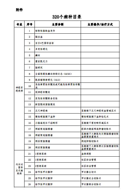 2017年1月10日,三部委發布《關于推進按病種收費工作的通知》,除了要求“各地二級及以上公立醫院都要選取一定數量的病種實施按病種收費,城市公立醫院綜合改革試點地區2017年底前實行按病種收費的病種不少于100個”之外,還公布了320個按病種收費病種(名單附后)。