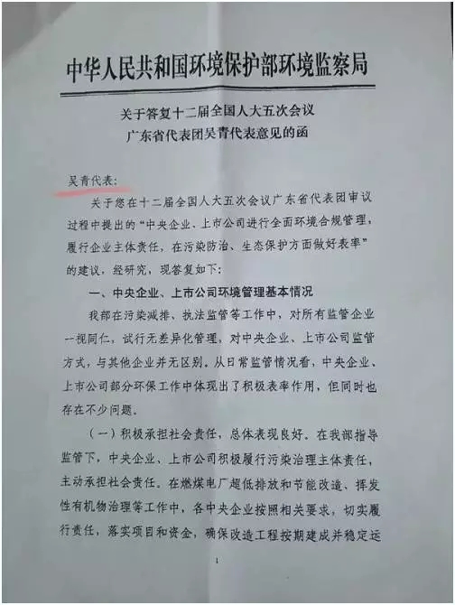 全國人大代表、北京市金杜(廣州)律師事務所合伙人吳青在參加十二屆全國人大五次會議廣東省代表團的審議過程中,提出了“中央企業、上市公司進行全面環境合規管理,履行企業主體責任,在污染防治、生態保護方面做好表率”建議。