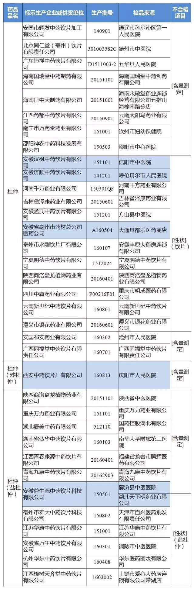 經陜西省食品藥品檢驗所檢驗,標示為安國祁安藥業有限公司、安國市輝發中藥飲片加工有限公司、吉林省澤康藥業有限公司、江蘇華康中藥飲片有限公司、杭州華東中藥飲片有限公司、安徽省萬生中藥飲片有限公司、安徽孟氏中藥飲片有限公司、北京同仁堂(亳州)飲片有限責任公司、亳州市永剛飲片廠有限公司、亳州市宏大中藥飲片科技有限公司、江西青春康源中藥飲片有限公司、江西藥都中藥飲片有限公司、江西樟樹天齊堂中藥飲片有限公司、河南千方藥業有限公司、湖北辰美中藥有限公司、湖南省弘華中藥飲片有限公司、邵陽神農中藥科技發展有限公司、廣東恒祥中藥飲片有限公司、廣西同福堂中藥飲片有限責任公司、南寧市萬藥堂藥業有限公司、海南國瑞堂中藥制藥有限公司、海南日中天制藥有限公司、重慶萬力藥業有限公司、四川中庸藥業有限公司、遵義市銀花藥業有限公司、云南新世紀中藥飲片有限公司、陜西商洛盤龍植物藥業有限公司、青海九康中藥飲片有限公司、寧夏明德中藥飲片有限公司等企業生產的35批次杜仲不合格。不合格項目包括含量測定、性狀。
