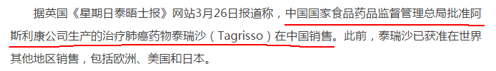 在2016年2月份的時候,CFDA發布了《關于解決藥品注冊申請積壓實行優先審評審批的意見》,稱將對新藥、臨床急需或質量療效明顯改進藥品優先審批。泰瑞沙是經中國國家食品藥品監督管理總局優先審批通道批準的第一種藥物。