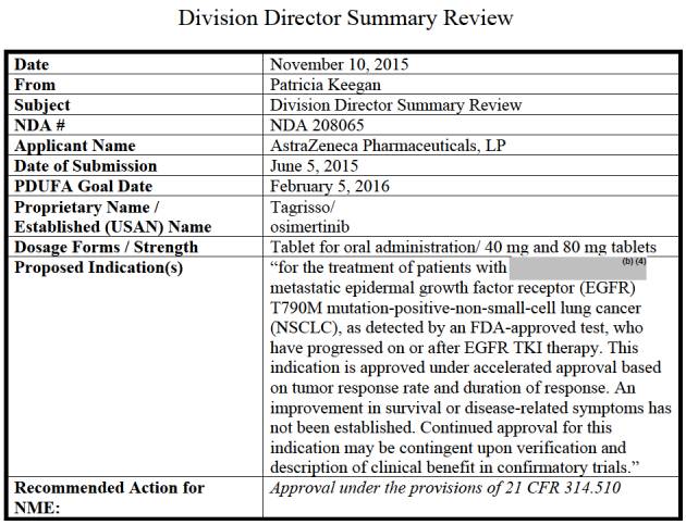 泰瑞沙就是用于EGFR T790M突變陽性的局部晚期或轉移性非小細胞肺癌的腫瘤藥物,給這些產生耐藥的患者帶來了希望。去年9月,基于晚期肺癌患者的臨床急需及奧希替尼與現有治療相比明顯的治療優勢,CFDA將其列入優先審評名單,并予以加速批準,6個月后,批準其在國內上市。