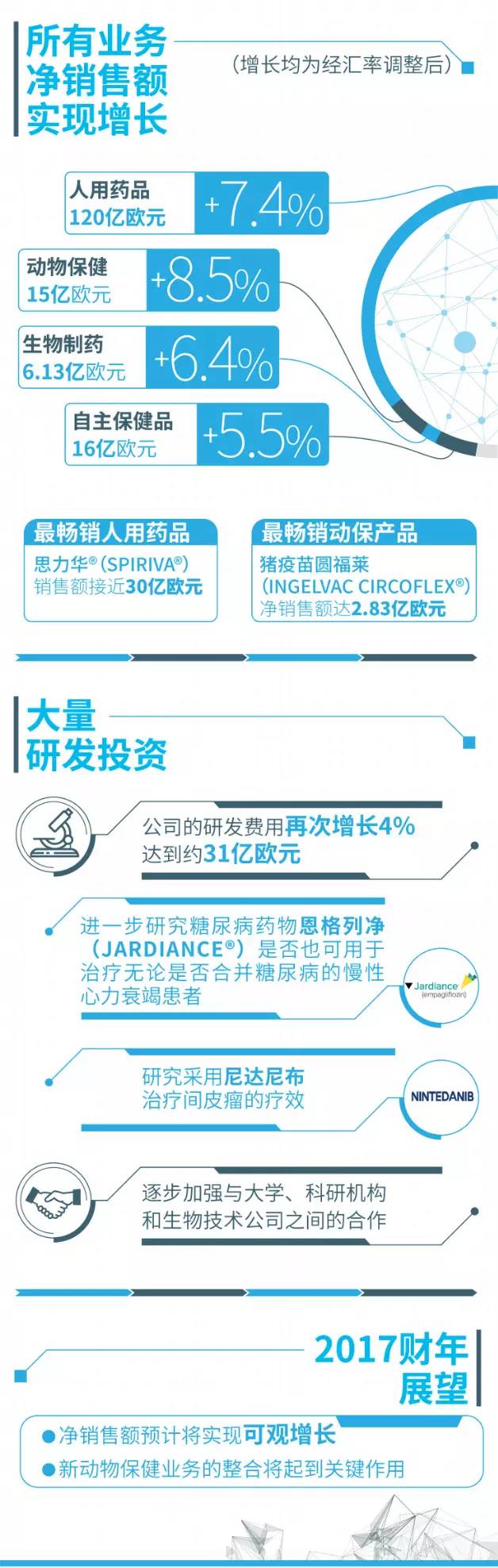 所有業務的凈銷售額都實現了增長;同時,公司于2016年按計劃完成了全面轉型;未來,公司將把業務重點放在人用藥品、動物保健和生物制藥合同生產領域。