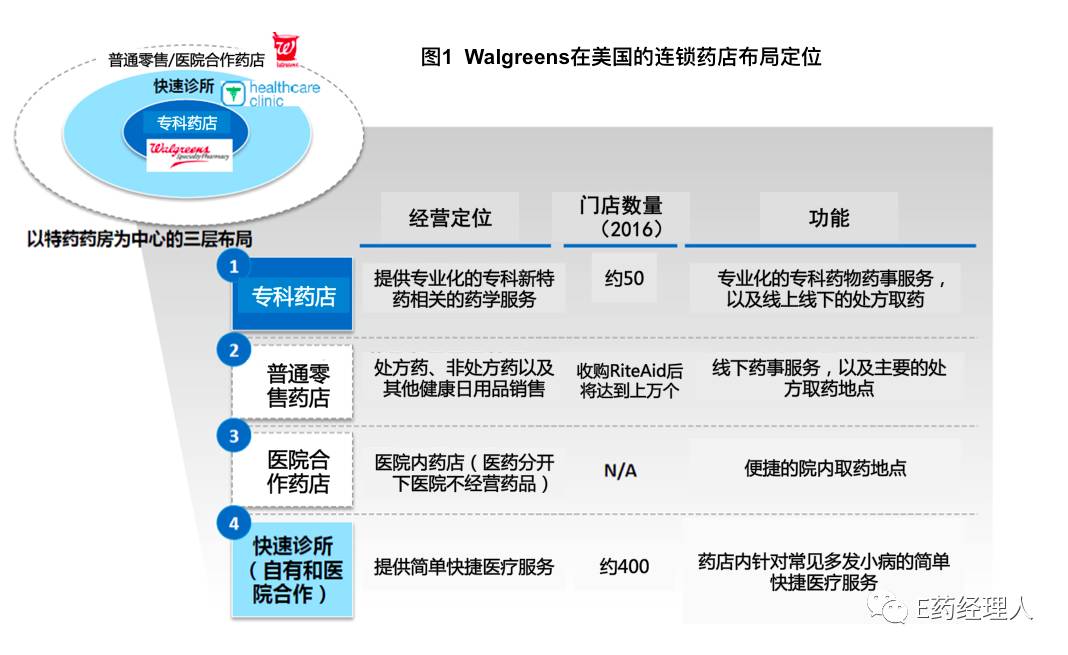 在美國,WBA于2016年收購了RiteAid藥店,成為了美國銷售收入和零售門店最大的藥品零售連鎖巨頭。在這之前,WBA 與美國藥品分銷巨頭AmerisourceBergen簽訂十年期的戰(zhàn)略聯(lián)盟關系,形成了藥品的零售和分銷業(yè)務之間的緊密聯(lián)系和協(xié)同效應。此外,更重要的是,根據(jù)客戶不同的臨床需求和購藥習慣,WBA在美國布局了完全不同類型的零售藥店形態(tài),用以滿足客戶之間的不同需求(圖1)。