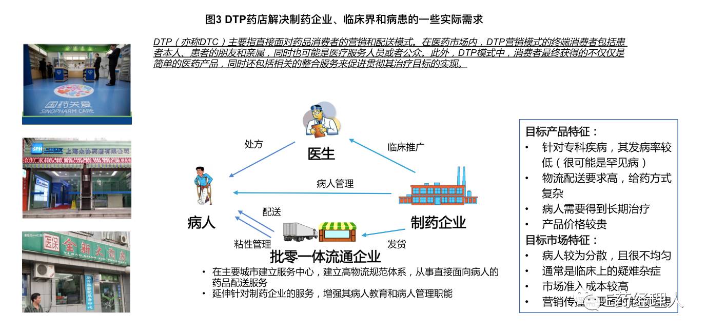 這些不同類型的零售藥店的經(jīng)營行為或者經(jīng)營業(yè)態(tài)之間存在一定的差異,不過它們的理念應當是大同小異的。與醫(yī)藥分銷業(yè)務開展增值服務類似,如何最大效率地協(xié)調(diào)有效資源,滿足臨床各方面的需求將是企業(yè)核心競爭力的體現(xiàn)。這在藥品零售業(yè)內(nèi)新興的DTP業(yè)務中表現(xiàn)得也最為明顯(圖3)。