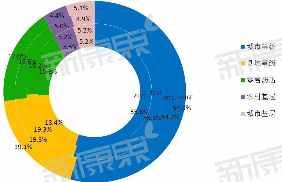 中康CMH的監測數據顯示,在五大銷售終端中,類風濕關節炎藥物2015年在城市等級醫院中銷售規模達311億元,占超過一半以上的市場份額(54.2%),但2015年的市場份額比2014年下降了0.9個百分點,2016年將有小幅上升。其在2015年縣域等級醫院的銷售規模達111億元,占比為19.3%;同時零售藥店的銷售額為95億元,預計2016年將突破100億元大關。隨著政府對醫療市場的整革,縣域醫院也越發受到重視,類風濕關節炎藥物在縣域醫院終端及零售藥店的的發展機會將增多,市場規模也將會呈現更好的增長勢頭。