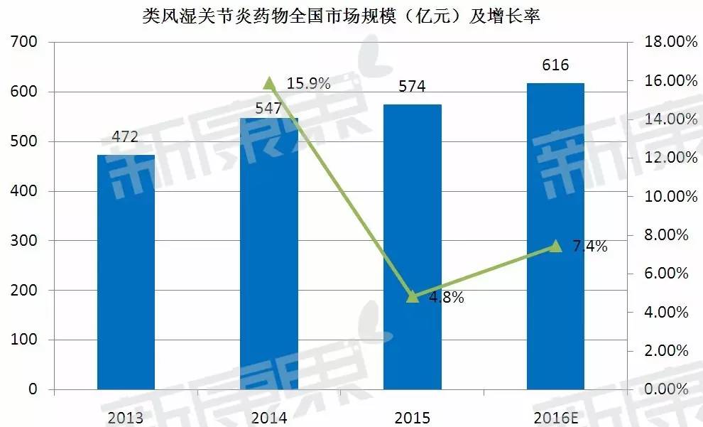 國內的RA藥物市場規模從2013——2016年保持著穩步擴大的趨勢,2015年的銷售額達到574億元,預測2016年將會上升到616億元,年復合增長率將達到6.9%。