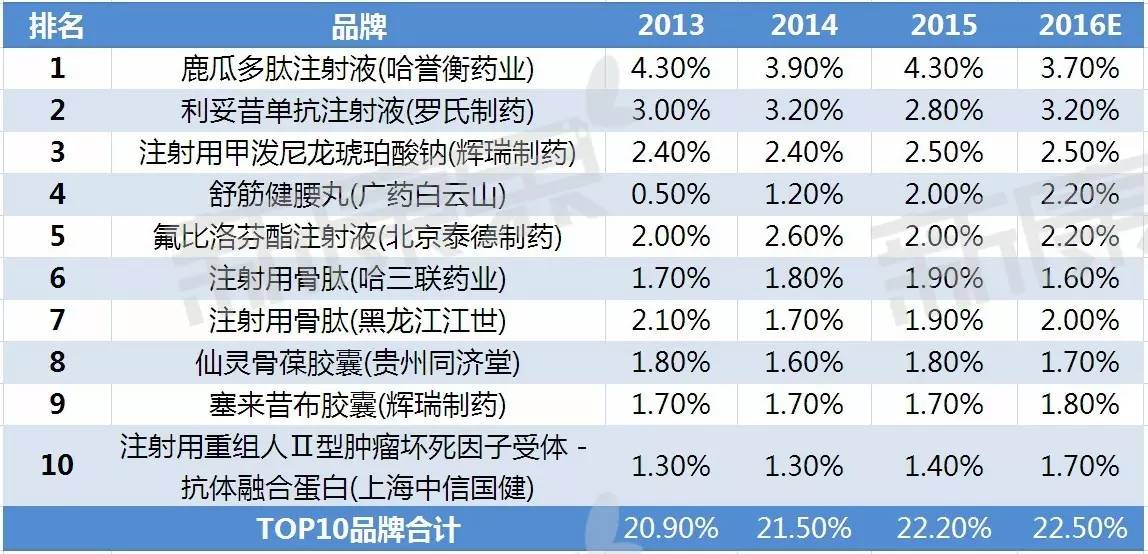從中康CMH監測數據來看,類風濕關節炎藥物Top10品牌2015年市場規模達127億元,比2014年增長了8.2%,Top10品牌的市場占比合計為22.2%,市場集中度較低,說明該領域競爭激烈。其中,哈譽衡藥業的鹿瓜多肽注射液以4.3%的市場份額高居榜首。另外,在這top10 品牌中,生物藥占了一半,以絕對優勢占主導地位,雖然生物藥在該領域的整體上不占優勢,但其在品牌排名中表現出強大的競爭優勢,一方面可能是當今藥物的發展趨勢向生物藥靠近,另一方面可能是藥物的療效方面,生物藥具有更大的優勢,發展潛力大;在Top10 品牌中,內資企業占七個席位,表現出強勁的競爭力。
