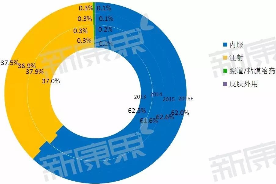 據中康CMH的數據,類風濕關節炎藥物主要是通過內服和注射給藥,兩類用藥途徑的藥物幾乎占據了整個市場。其中內服藥物是主導,其市場規模從2013年——2015年表現出不斷增長的趨勢,2015年高達359億元,且市場份額都在60%以上。