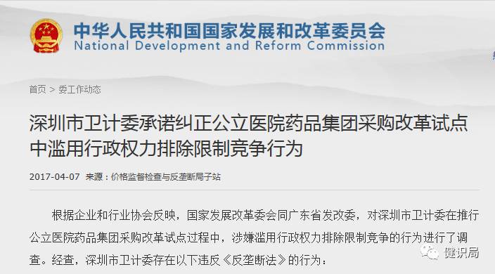 此次發改委的公告顯示,根據企業和行業協會反映,國家發展改革委會同廣東省發改委,對深圳市衛計委在推行公立醫院藥品集團采購改革試點過程中,涉嫌濫用行政權力排除限制競爭的行為進行了調查。經查,深圳市衛計委存在以下違反《反壟斷法》的行為:
