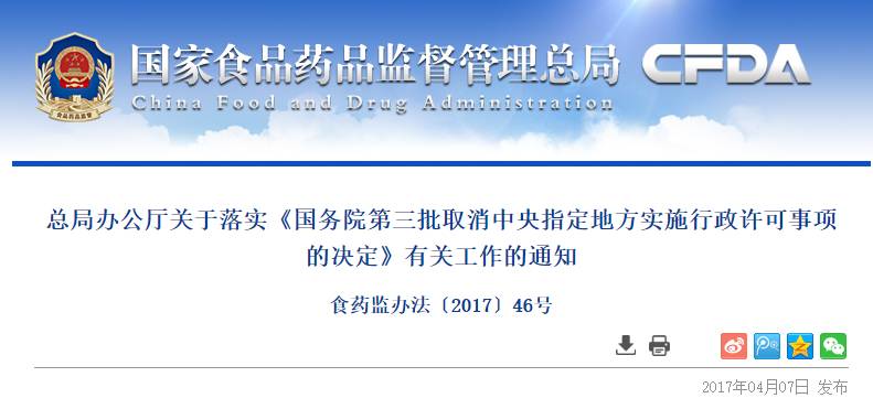 各省級食品藥品監管部門應抓緊做好取消行政許可事項的落實和銜接工作,對決定取消的行政許可事項,自《國務院關于第三批取消中央指定地方實施行政許可事項的決定》(國發〔2017〕7號)發布之日起,各省級食品藥品監管部門不再受理上述取消的行政許可事項的申請;發布之日前省局已受理,截止發布之日尚未完成審批的,應終止審批,將申請材料退還申請人。原許可部門不得再實施許可或以其他名目變相審批,同時要加強事中事后監管,切實做到放管結合。